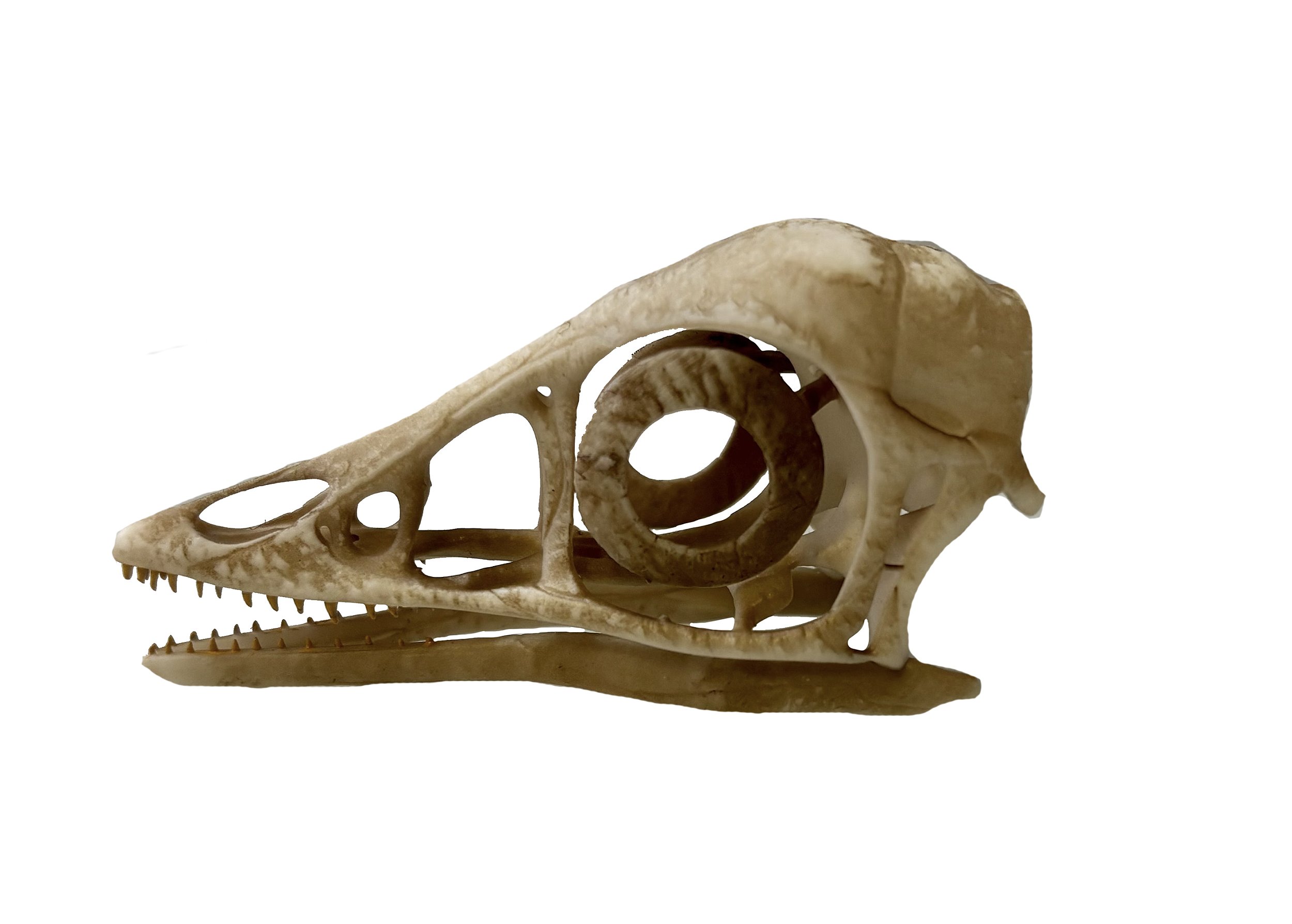 Réplica de crânio de Archaeopteryx lithographica em resina com pintura acrílica e verniz automotivo fosco. Tamanho: 6 centímetros de comprimento