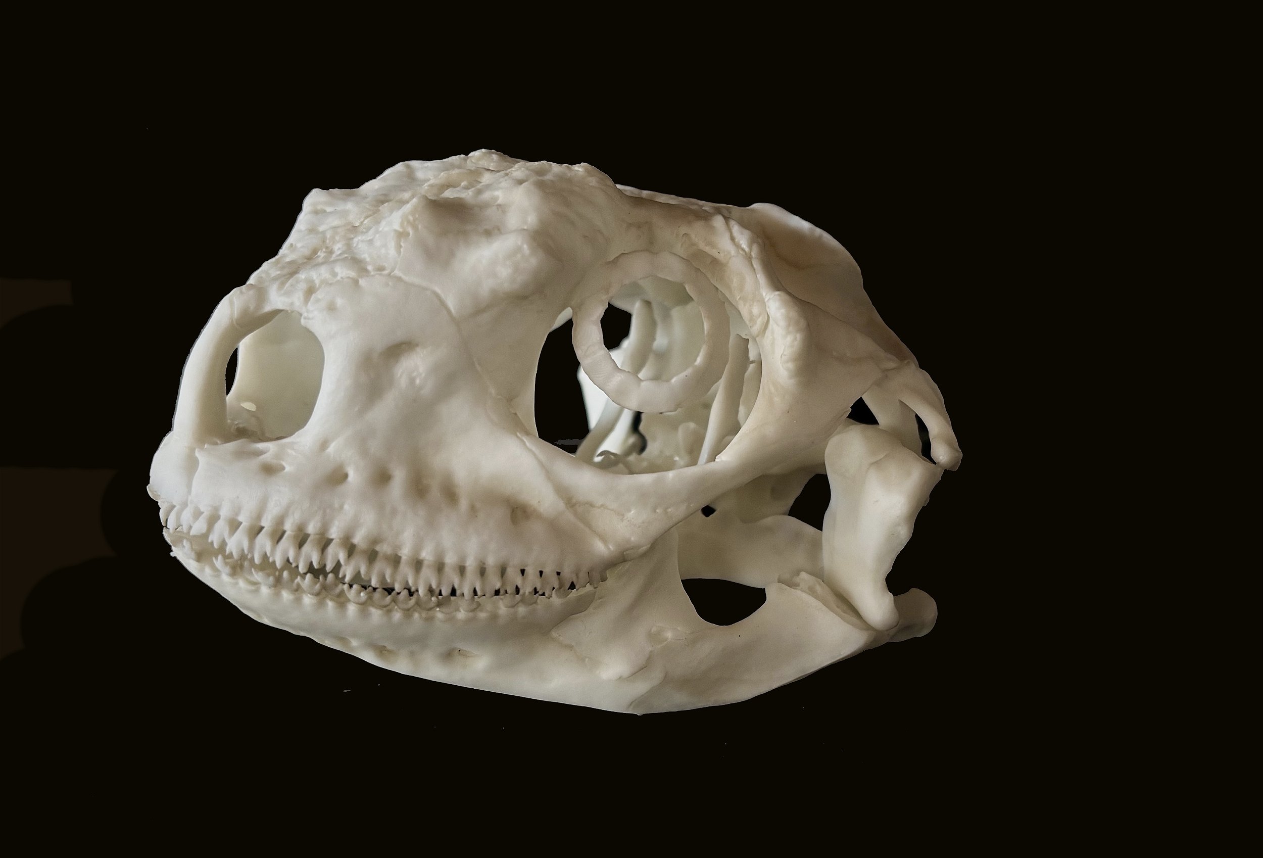 Réplica em resina do crânio de Iguana Marinha (Crânio de Iguana Marinha (Amblyrhynchus cristatus) com 11 centímetros de comprimento.