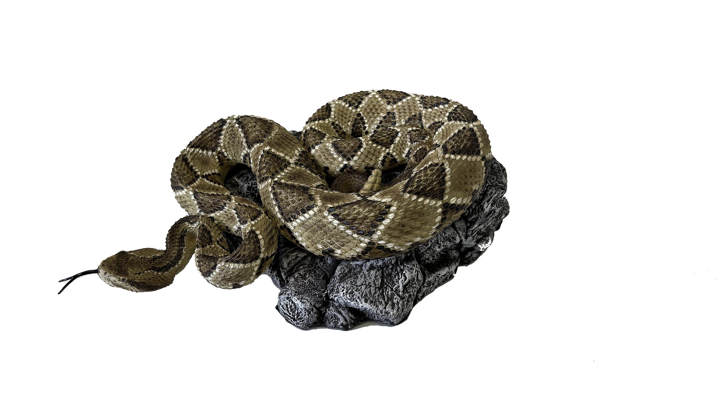 Diorama de cascavel (Crotalus durissus) em cima de uma rocha. Feito em poliresina, pintura acrílica e verniz automotivo. Peça com, aproximadamente, 20 centímetros de diâmetro.